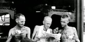 Αποστεωμένοι, οι ελάχιστοι αιχμάλωτοι που επέζησαν από τα στρατόπεδα των Ιαπώνων διαβάζουν στην εφημερίδα για τις ατομικές βόμβες στη Χιροσίμα και το Ναγκασάκι
