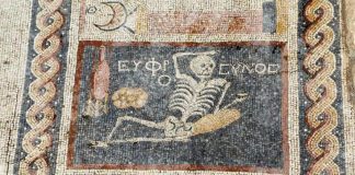 Μωσαϊκό με «χαρούμενο σκελετό» 2.400 ετών βρέθηκε στην Αντιόχεια. Κρατά στο χέρι του μία κούπα κρασί και υπογράφει ως «Ευφρόσυνος», δηλαδή αυτός που είναι χαρούμενος και ζει τη ζωή του