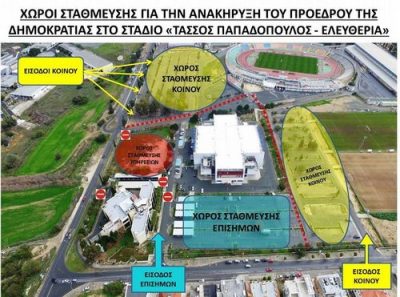 Όπως αναφέρει σχετική ανακοίνωση, η Αστυνομία Κύπρου, ενημερώνει το κοινό ότι το βράδυ της Κυριακής 4 Φεβρουαρίου, 2018, θα λάβει αυξημένα μέτρα ασφάλειας κατά την τελετή ανακήρυξης του Προέδρου της Δημοκρατίας. Τα μέτρα θα εφαρμοστούν στο Στάδιο «ΤΑΣΣΟΣ ΠΑΠΑΔΟΠΟΥΛΟΣ – ΕΛΕΥΘΕΡΙΑ» στη Λευκωσία, όπου θα γίνει η τελετή ανακήρυξης από τον Γενικό Έφορο Εκλογής, τόσο κατά την προσέλευση, όσο και κατά την αποχώρηση του κοινού.