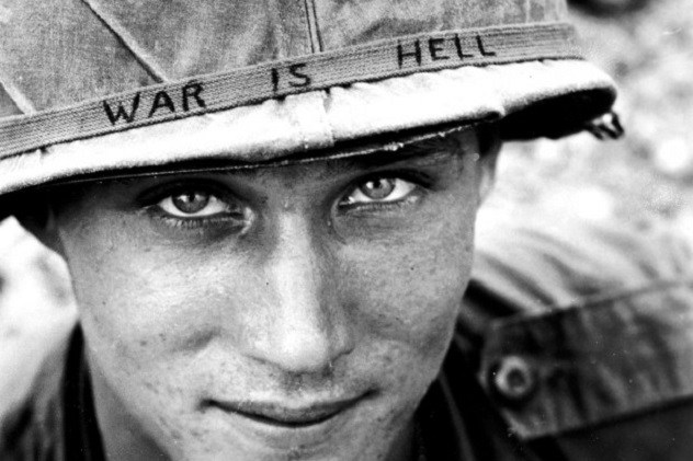 Μια από τις φωτογραφίες ήταν και η παραπάνω, στην οποία απεικονίζεται ένας νεαρός Αμερικανός στρατιώτης της 173η αερομεταφερόμενης ταξιαρχίας πεζικού, ο οποίος έγραψε στο κράνος του στο μήνυμα «ο πόλεμος είναι κόλαση».