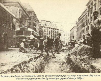 Ήταν όμως αργά. Μία από τις γραμμές αποσπάστηκε, ανασηκώθηκε με τις τανάλιες θριαμβευτικά ως σύμβολο και μεταφέρθηκε με δυσκολίες στο πεζοδρόμιο. Ένας ψηλός και νεότατος άνδρας έσκυψε και άγγιξε τη σιδηροτροχιά με το χέρι του. Αναγνώρισα τον Κωνσταντίνο Καραμανλή”.