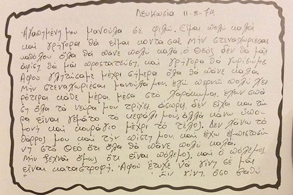 «Αγαπημένη μου μανούλα σε φιλώ. Είμαι πολύ καλά και γρήγορα θα είμαι κοντά σας. Μην στενοχωριέσαι καθόλου, όλα θα πάνε πολύ καλά, ο Θεός δεν θα μας αφήσει. Θα μας προστατεύσει και γρήγορα θα γυρίσουμε. Αφού γλυτώσαμε μέχρι σήμερα όλα θα πάνε καλά. Μην στενοχωριέσαι μανούλα μου, εγώ περνώ πολύ χειρότερα κάθε μέρα μέσα στο χαράκωμα, έχουν σπάσει όλα τα νεύρα μου. Τρίχες άσπρες, δεν είχα και τώρα είναι γεμάτο το κεφάλι μου, αλλά κάνω υπομονή και κουράγιο μέχρι το τέλος. Δεν χάνω το θάρρος μου και την πίστη μου και έχω εμπιστοσύνη στο Θεό ότι όλα θα πάνε πολύ καλά. Μην ξεχνάς όμως ότι είναι πόλεμος και ο πόλεμος είναι καταστροφή. Αφού έτυχε να γίνει σε μας θα το υποστούμε ό,τι και αν γίνει, όσο βαθύ και ορμητικό αν είναι το ποτάμι όταν υπάρχει βία και ανάγκη και όταν μας το επιβάλλουν πρέπει να το περάσουμε.